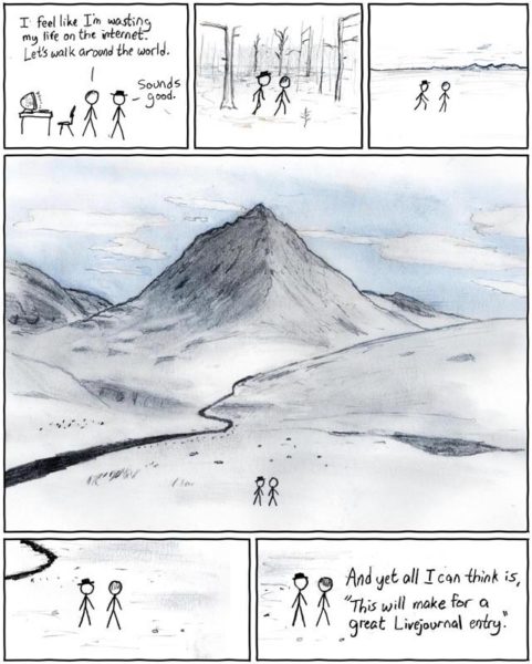 一个有头发的人物(不要与毛茸茸混淆)向黑帽建议他在互联网上浪费生命,他们应该去探索这个世界。他们似乎走过很远的距离,穿过看似沼泽的地方,或者冬天的森林,穿过平原,一直到河谷。尽管到目前为止旅行并经历了各种各样的景观,但在最后一个小组中,其中一个角色承认他所能想到的就是他们的旅行将会发布的一篇伟大的Livejournal帖子。似乎让互联网失去理智的计划失败了。