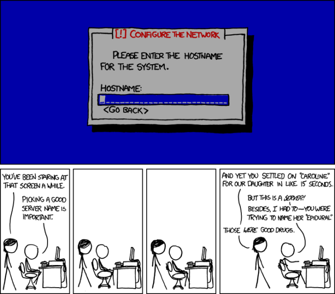 顶部面板是Debian安装程序的草图,显示了菜单驱动前端的主机名对话框。 Cueball希望确保他选择一个伟大的永久名称,他可以给他正在运行的服务器。