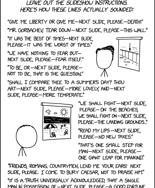 Title Text:”I have nothing to offer but blood–next slide, please–toil–next slide, please–tears, and–next slide, please–sweat.” Origin:https://xkcd.com/2470/ https://www.explainxkcd.com/wiki/index.php/2470:_Next_Slide_Please 下一张幻灯片 “我没有别的能奉献的,只有热血–下一张—辛劳–下一张—眼泪与–下一张—汗水。” http://xkcd.in/comic… Read more