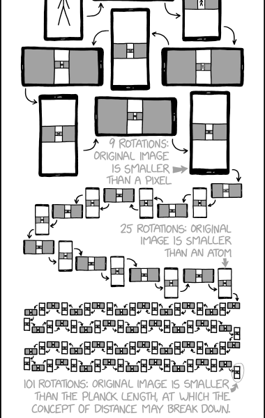 25 次旋转进一步减少了很多,对数对于计算它很有用。L为 log( a / b ),负数,因为a / b小于1。如果原始屏幕为 10cm 宽,则其缩小后的图片宽度将缩小x ^25 倍。漫画告诉我们,图片现在“比原子还小”(通常为 10^-10m)。如果指的是宽度,则使用以 10 为底的对数,25 L小于约 -9.0。