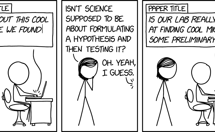 Cueball正在写一篇研究论文,标题是“看看我们发现的这个很酷的微生物”,带有点击诱饵、吹嘘和描述性不足的标题。他的同事梅根问他,科学是否应该是关于提出假设并检验它的。Cueball 同意,将标题更改为“我们的实验室真的擅长寻找很酷的微生物吗?一些初步数据。” 然而,这仍然是一个过度宣传和描述不足的点击诱饵标题,声称是对作者自身能力的研究,由于作者是调查对象而缺乏客观性,这将是非常不寻常的。点击诱饵是 xkcd 上反复出现的主题,最近在2001 年:Clickbait-Corrected p 值。描述一种新生物体的研究文章的标题通常会包含作者为其提议的林奈名称,这是他们在一定限制范围内的特权。[1]